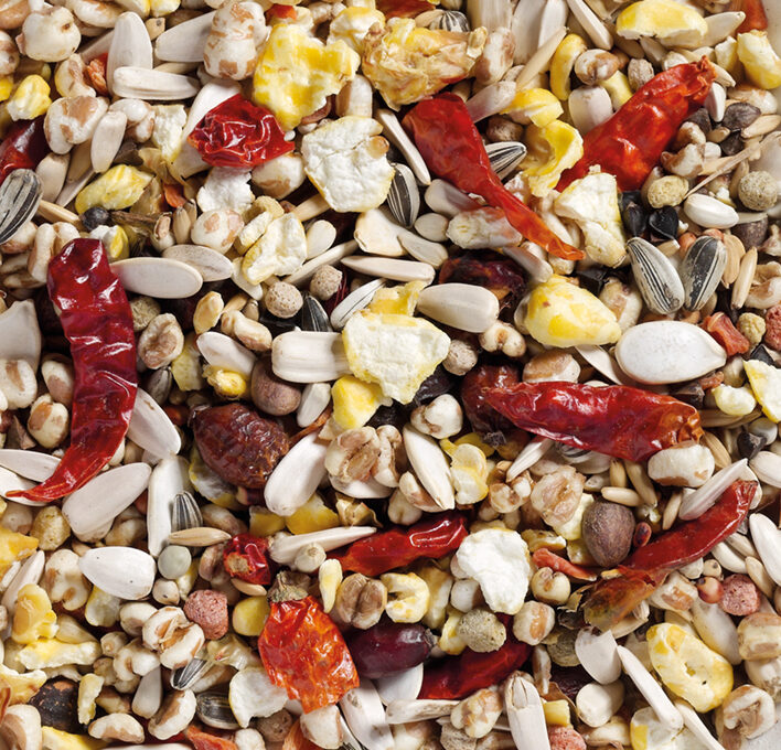 Zloženie: kardi, pohánka, biela slnečnica, červené mungo, pufovaný ovos, lúpaný ovos, pásikavá slnečnica, nelúpaná ryža, biele dari, biele proso, kúsky mrkvy, pufovaná kukurica, pufovaná pšenica, semená uhorky, extrudované granule, tekvicové semená, červené proso, chilli papričky, píniové a cédrové orechy, hrozienka, plody šípky.