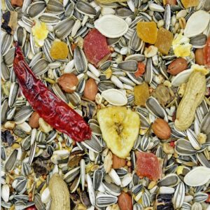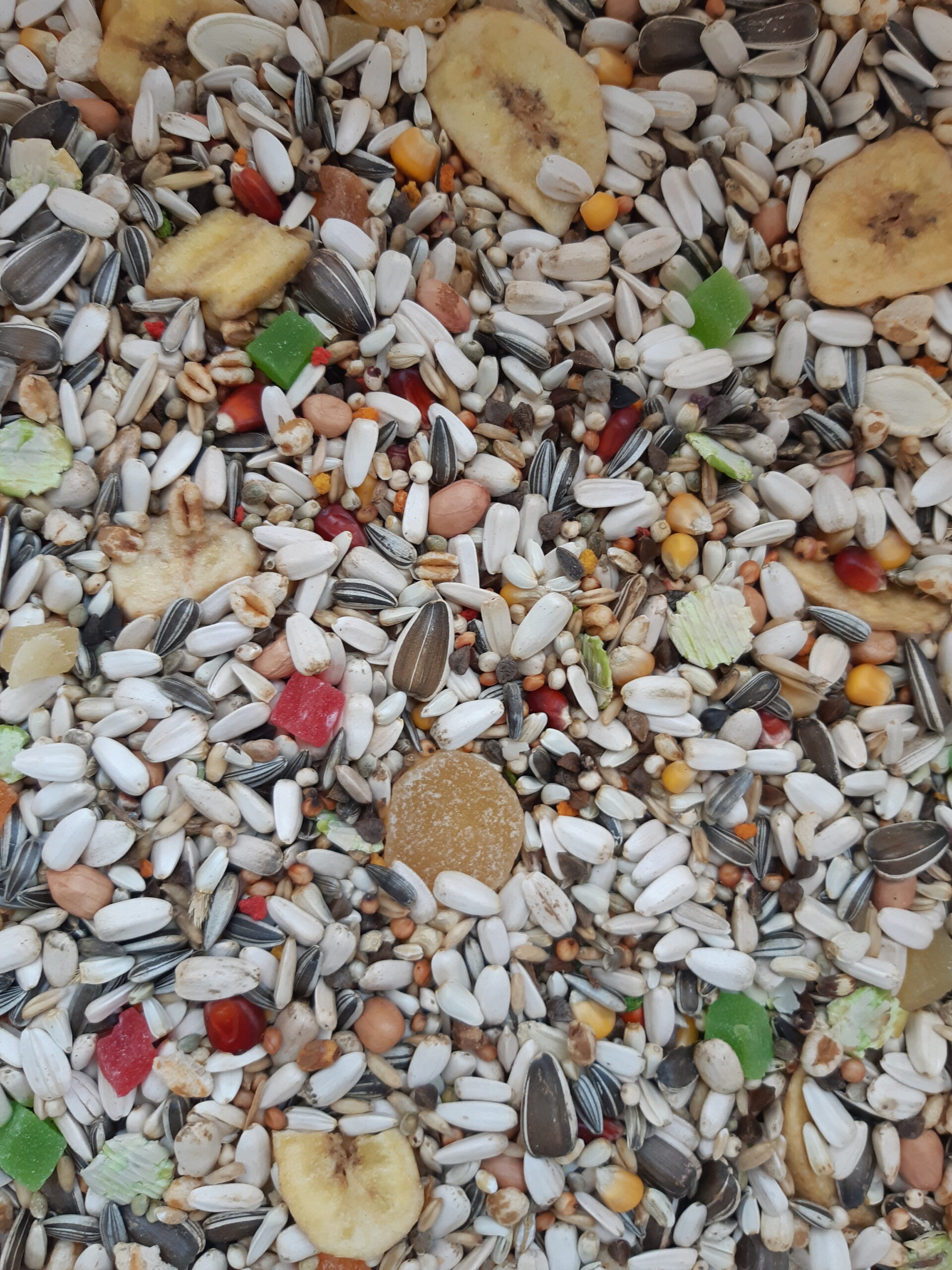 Veľmi bohatá zmes zrnín pre papagáje s obsahom ovocia a zeleniny ( ananás, papája, hrozienka,kokos,banány,mrkva..).